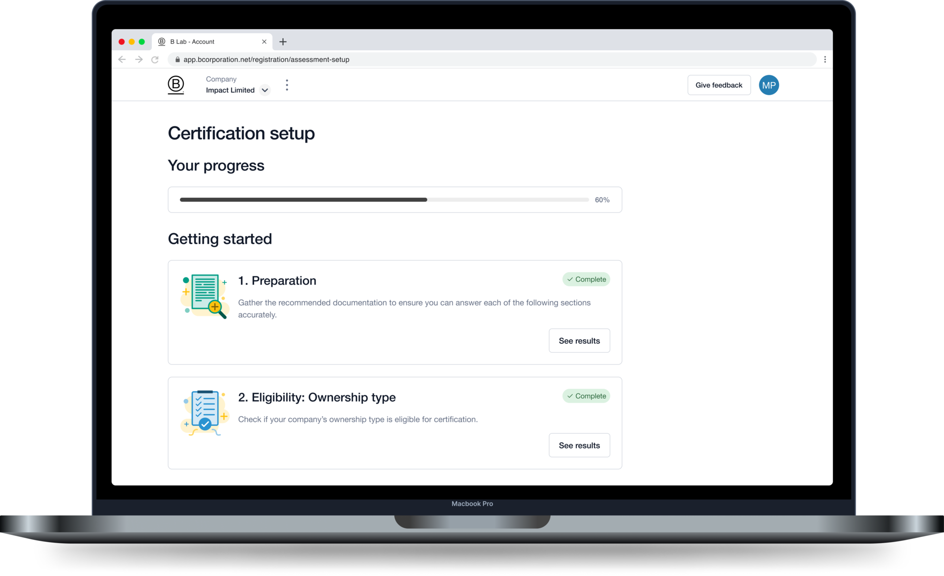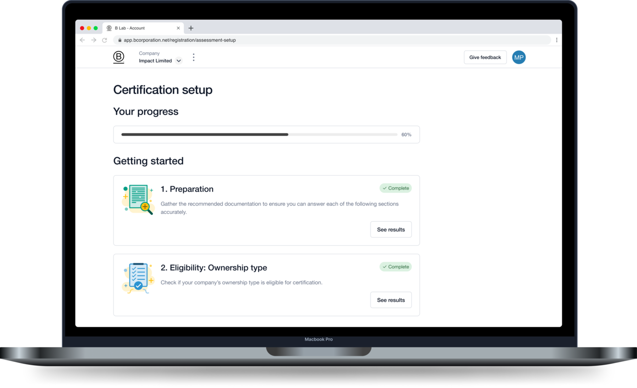 B Impact는 기업이 사회·환경적 임팩트를 한 곳에서 손쉽게 측정하고, 관리하며, 개선할 수 있도록 설계된 비랩의 새로운 디지털 플랫폼입니다. 비콥 인증은 B Impact 자가진단으로 시작됩니다.